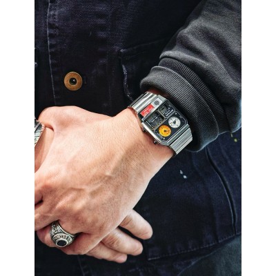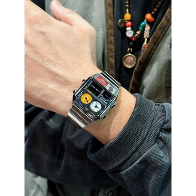 复古方块多功能中性手表户外运动钢带防水测温计时秒表闹钟电子表