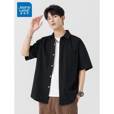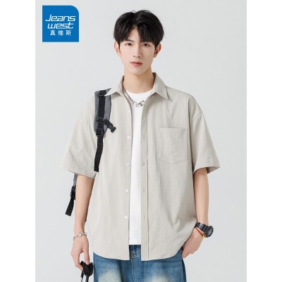 真维斯冰丝短袖衬衫男春夏季高级感痞帅宽松男生寸衫纯色衬衣外套