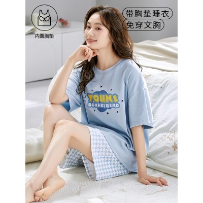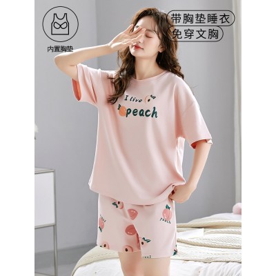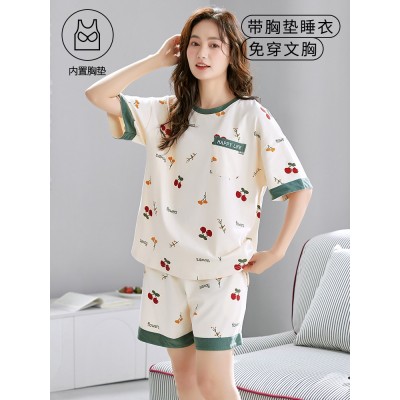 睡衣女夏纯棉带胸垫短袖短裤两件套薄款休闲卡通甜美可外穿家居服
