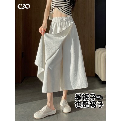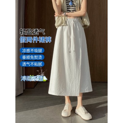 裙裤女夏薄款高腰显瘦宽松休闲杏色假两件小个子慵懒风开叉阔腿裤
